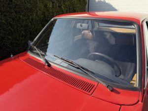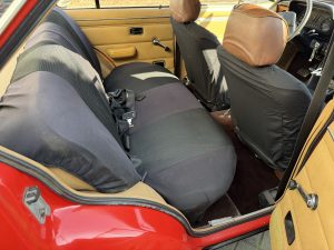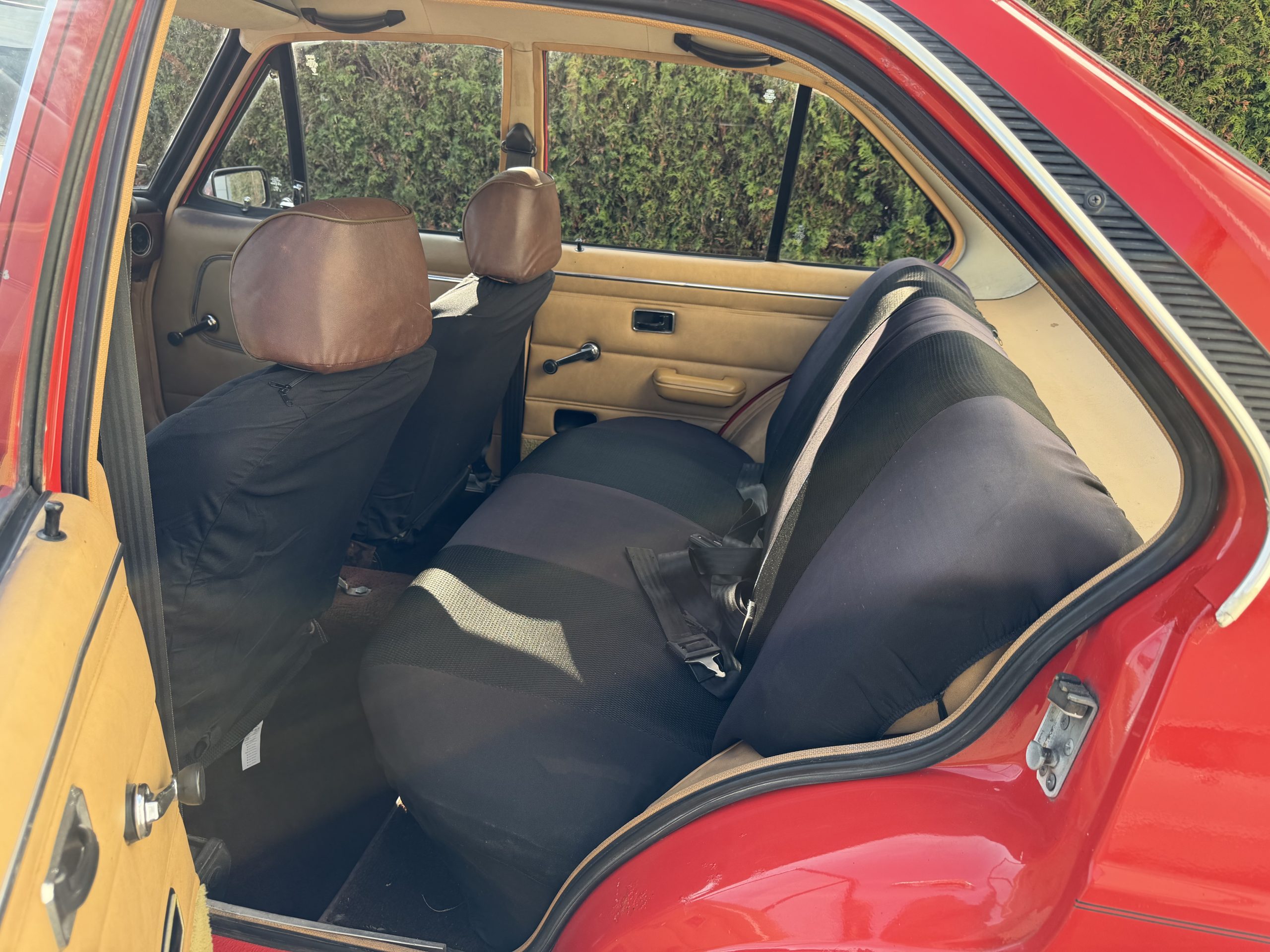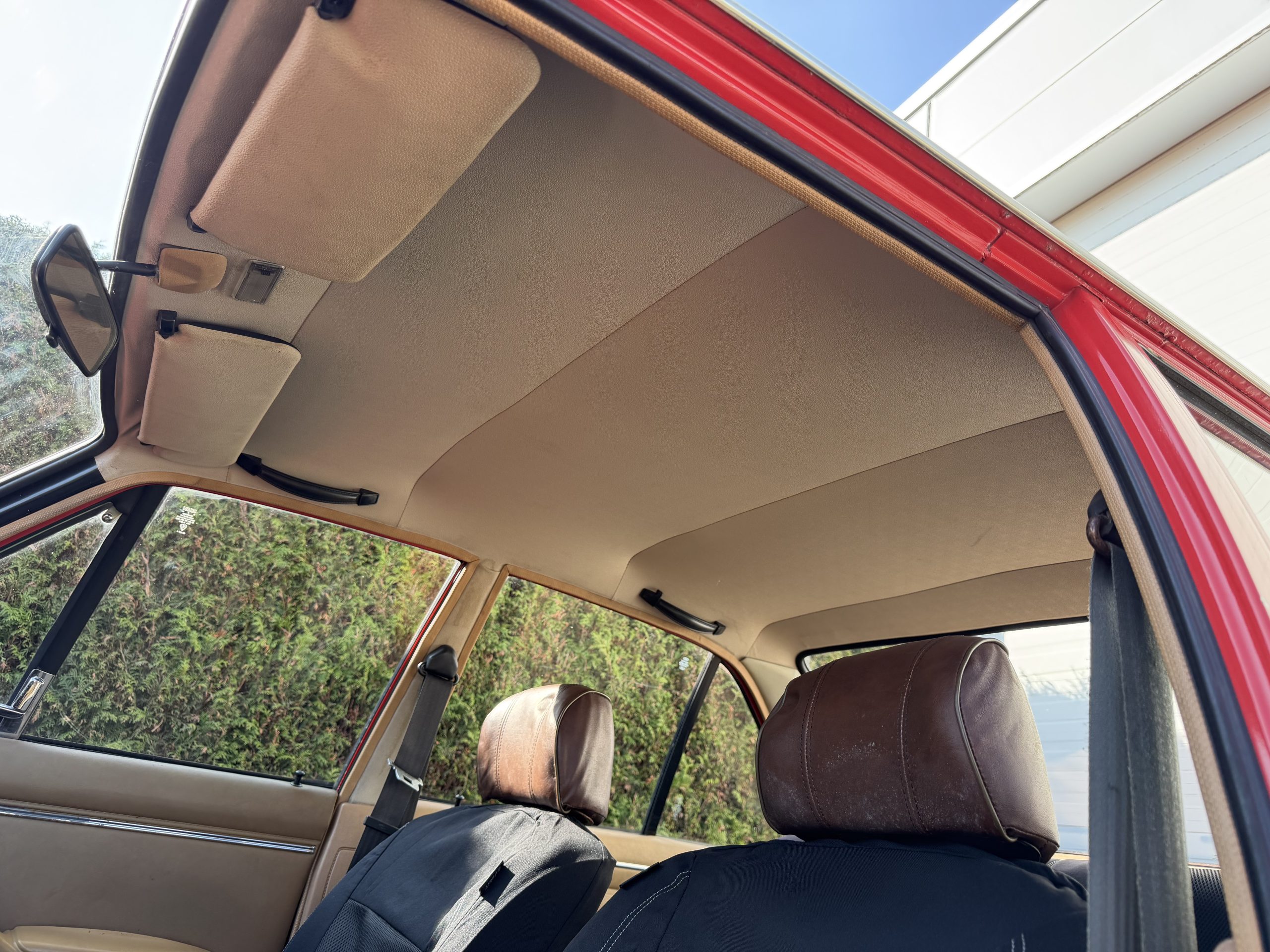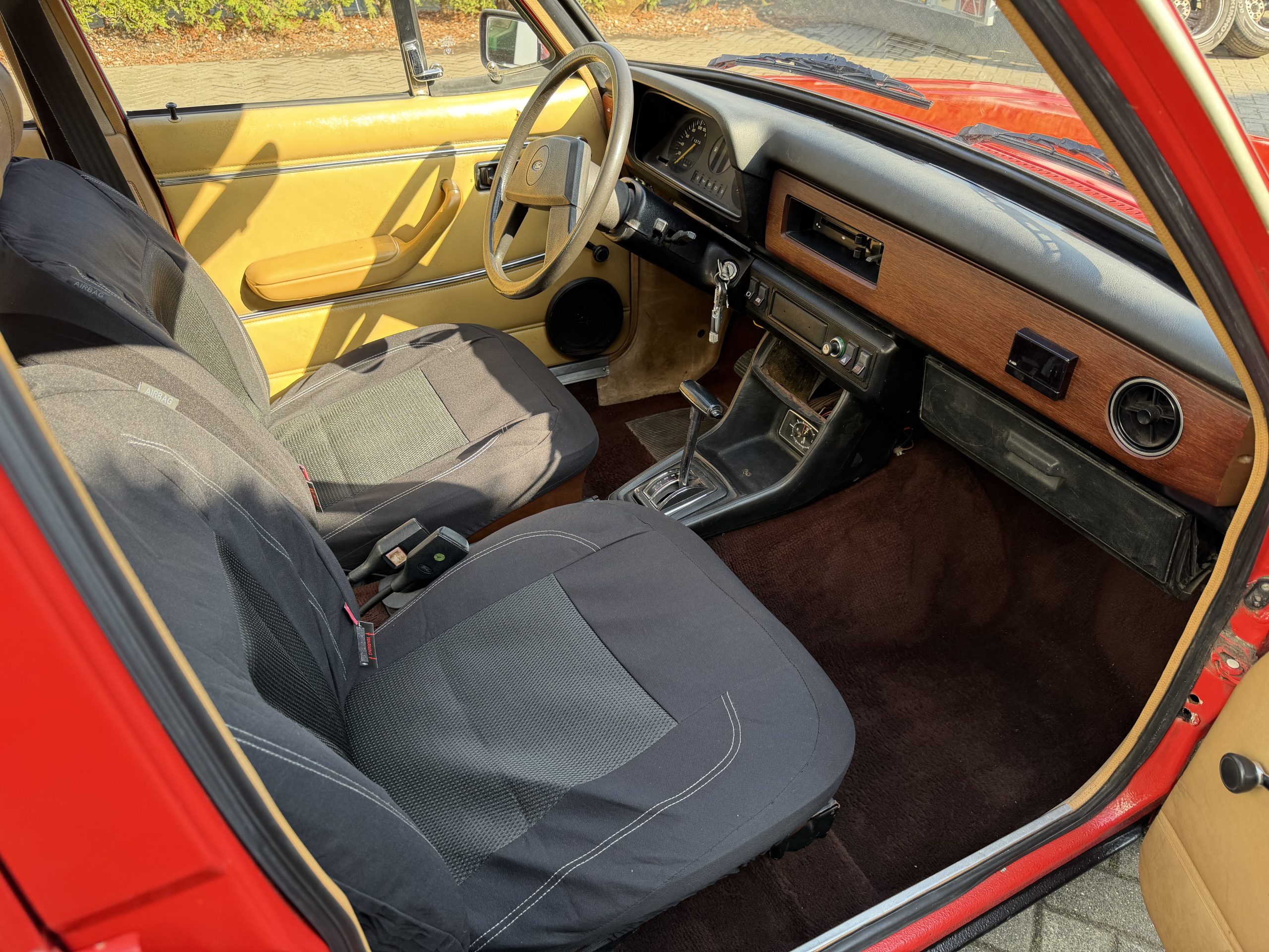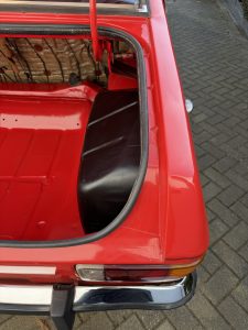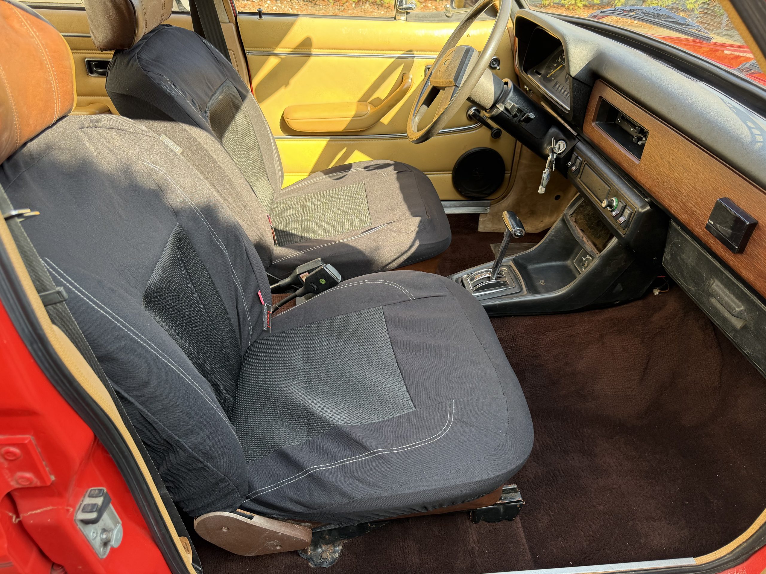 Het interieur is redelijk goed voor zijn leeftijd en helemaal compleet. Er zitten hoezen om de bekleding. De achterbank heeft wat droogte scheuren van de zon. Deze luxe Ghia heeft o.a. dashboard met toerenteller, dashboardkastje, luxe bekleding, klapramen in de voordeuren, hout inleg op het dashboard, middenconsole, van binnenuit verstelbare buiten spiegel, Chrome ringen in de velgen, bumper rosetten enz.